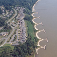 The site has a long fetch exposure to the south of over 12 miles and the southwest of over 5 miles. Wind frequencies from these directions are about the same, and the site occurs in what is considered a bimodal wind/wave setting. The developer of the upscale residential community wanted shore erosion control with environmental edge. A 2,800 ft breakwater system was installed in 1996. It consisted of six headland breakwaters ranging in size from 115 ft to 210 ft, a 110 ft low breakwater and a 170 ft revetment for boundary interfacing structures, beach fill, and wetlands plantings, all of which were designed for a 50-yr storm event. The site's seventy foot high banks had little sand and posed potential upland drainage problems. The design routed upland drainage to an adjacent marsh, and low swales in the bank were used to allow storm water to diffuse through a vegetated beach fill. Beach fill was obtained from an upland borrow pit. The design utilized existing reach morphology and shore erosion patterns along with a hydrodynamic analysis which included SMB, RCPWAVE, and SEB models for a bimodal wave climate.