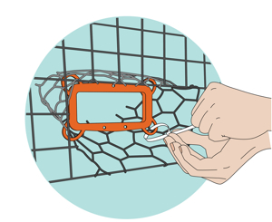 To install on a crab pot, position one BRD within each funnel opening and securely fasten to funnel with 4 hog rings per BRD; 1 at each corner of the BRD.